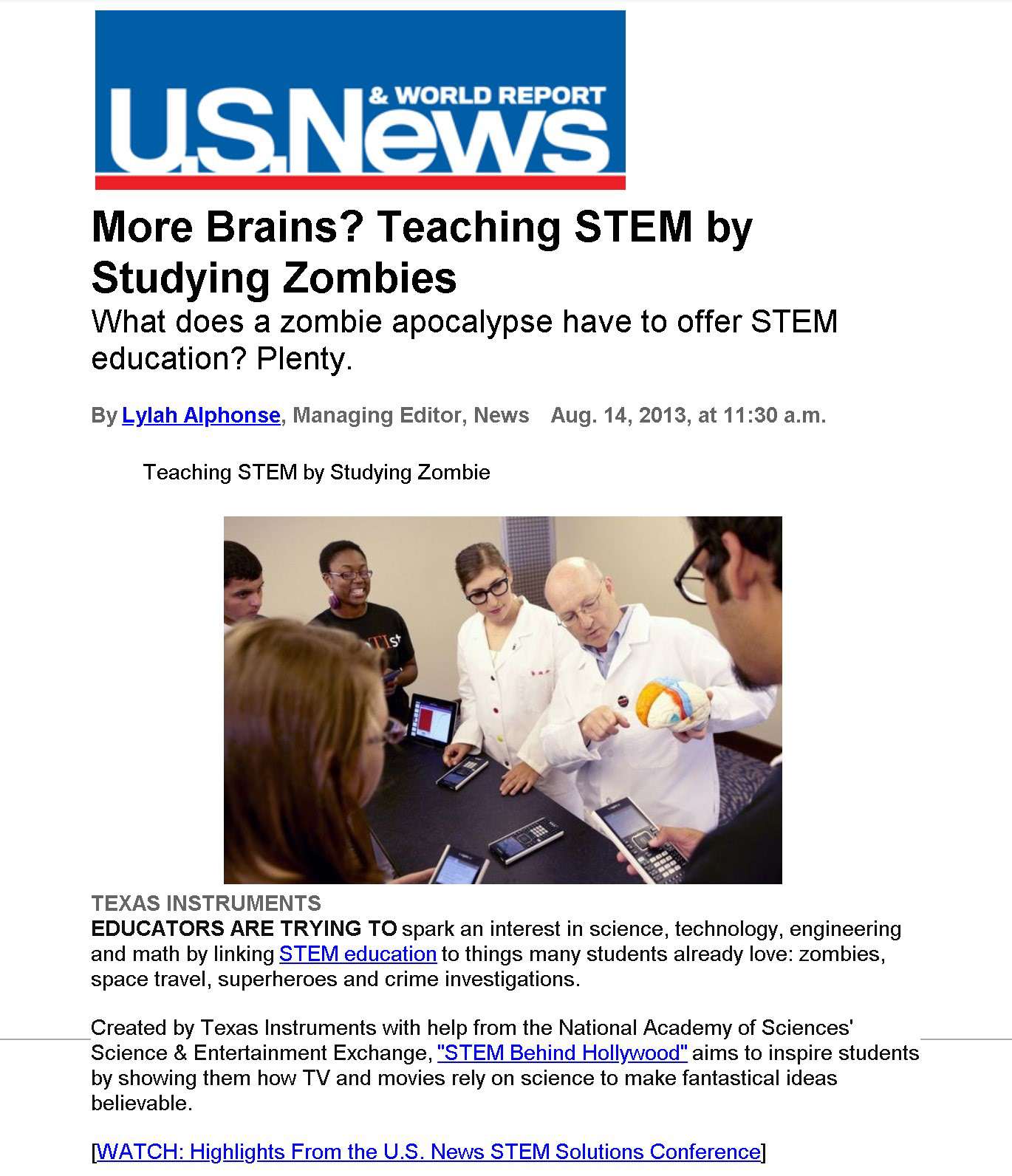 LINK TO ARTICLE BELOW FROM US NEWS & WORLD REPORTS ON TEACHING STEM BY STUDYING ZOMBIES